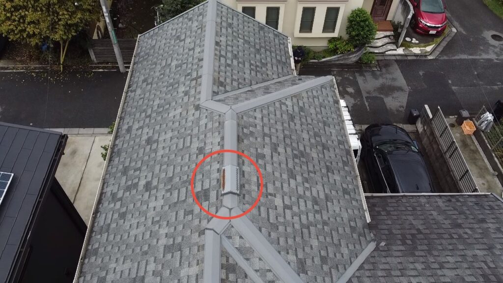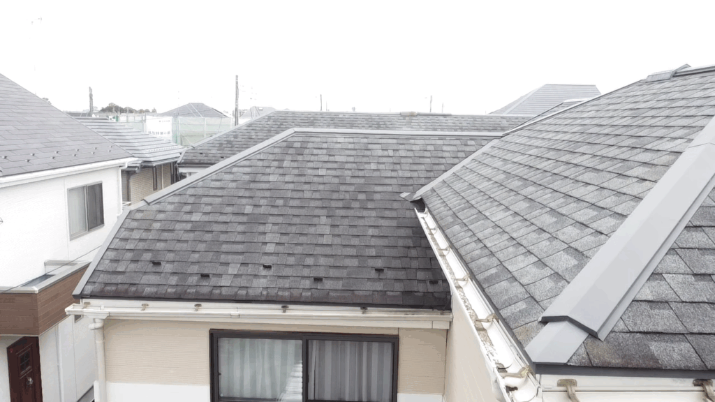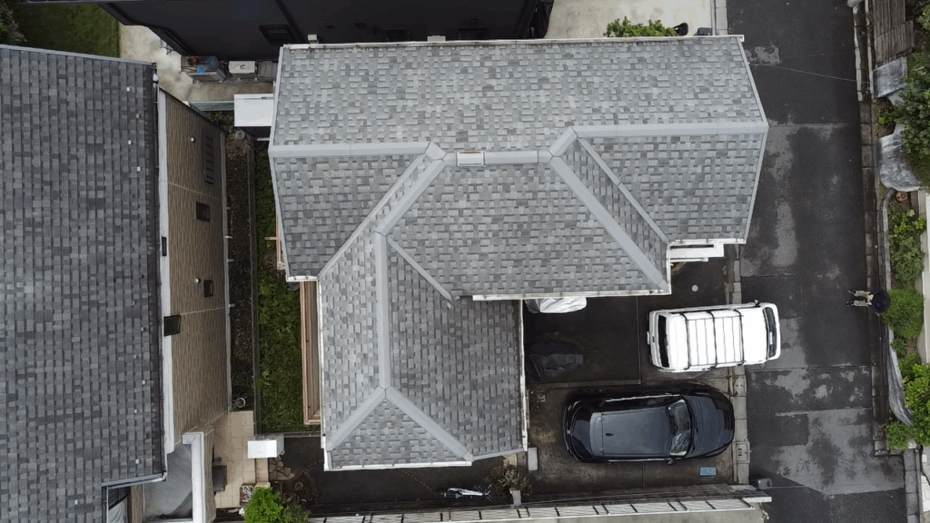 ドローンでの撮影で、屋根はアスファルトシングル屋根であることが分かりました。